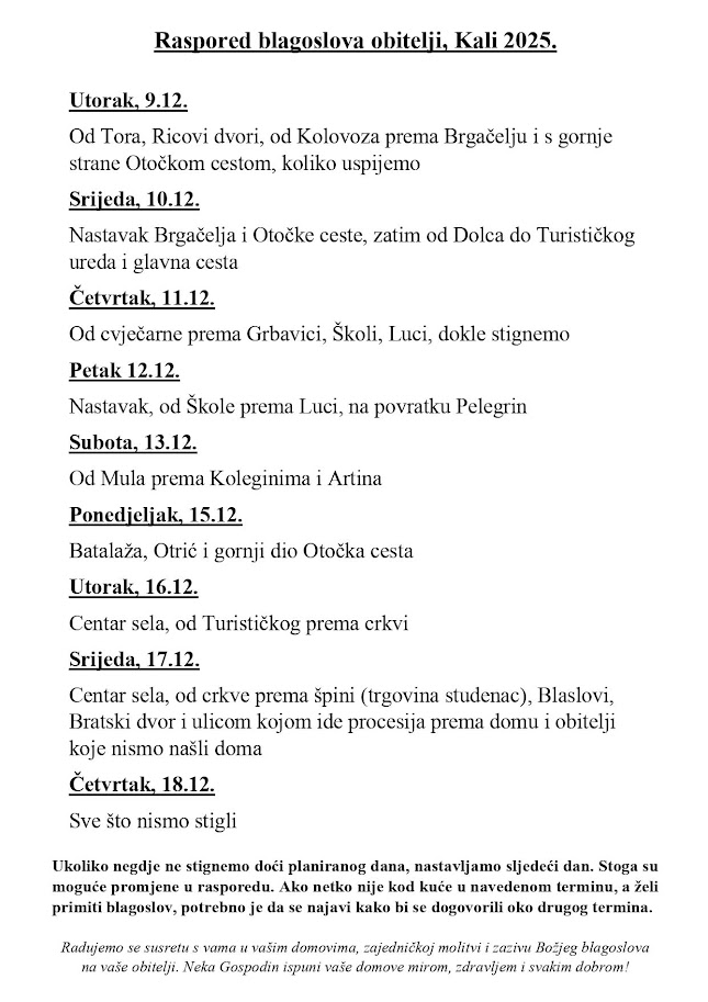 Srijeda, 17. prosinca: Centar sela, od crkve prema špini (trgovina Studenac), Blaslovi, Bratski dvor, i ulicom kojom ide procesija prema Domu, i obitelji koje nismo našli doma