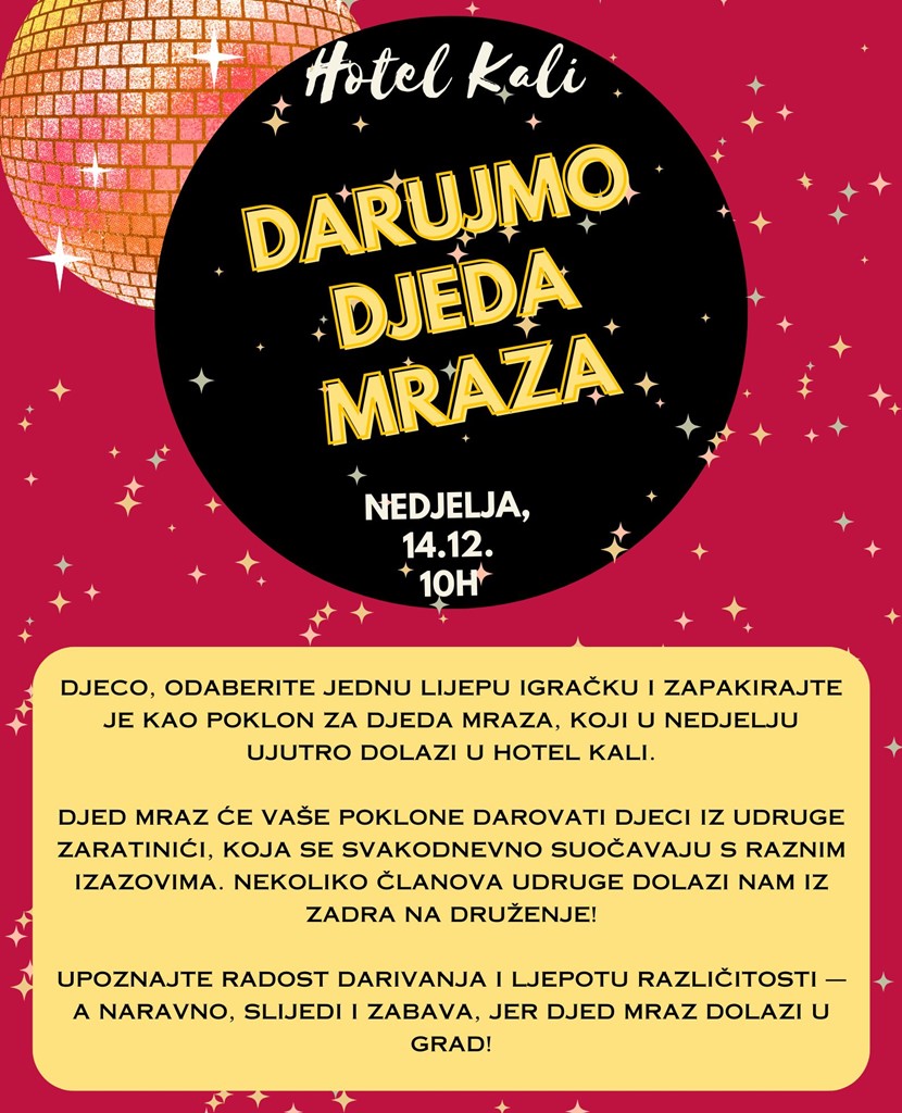 DARUJMO DJEDA MRAZA! - Hotel Kali organizira posebnu adventsku akciju kako bismo zajedno istaknuli važnost Božića i adventa kao vremena nade, zajedništva i darivanja. Pozivamo svu djecu da odaberu jednu svoju igračku koju već posjeduju, lijepo je zapakiraju kao poklon i donesu je Djedu Mrazu, koji nam stiže u nedjelju, 14.12., u 10:00 sati u Hotel Kali!