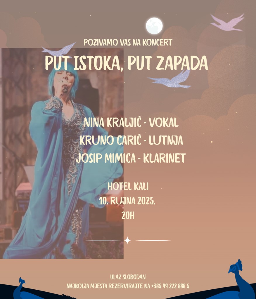 Glazbeni rujan u Hotelu Kali započinje koncertom 'Put istoka, put zapada' (Nina Kraljić - vokal, Kruno Carić - lutnja, Josip Mimica - klarinet) u Hotelu Kali dana 10. 9. 2025. u 20 sati.