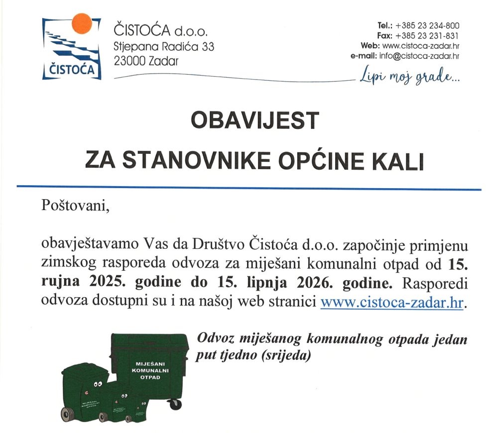 Čistoća d.o.o. Zadar obavještava korisnike s područja Općine Kali kako od 15. rujna 2025. uvodi zimski raspored odvoza miješanog komunalnog otpada, jednom u tjednu - srijedom.
