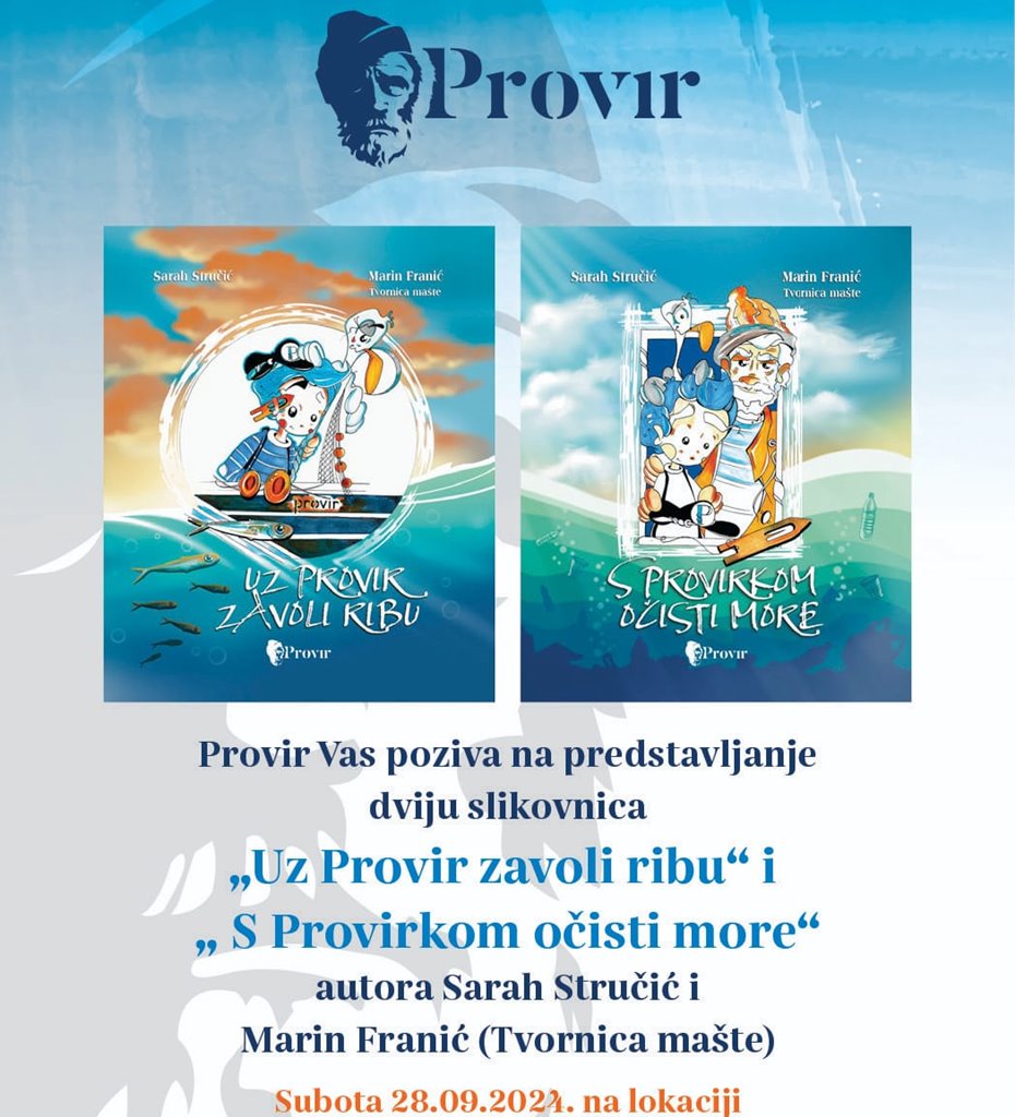 NAJAVA - Predstavljanje dviju slikovnica „S Provirkom očisti more“ i „Uz Provir zavoli ribu“ održat će se u subotu, 28. rujna, s početkom u 10:30 sati u Edukativno-prezentacijskom centru Sv. Nikola, koji je dio Međunarodnog centra za podvodnu arheologiju u Zadru (Ul. Božidara Petranovića 1).