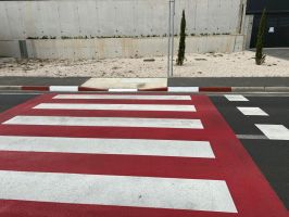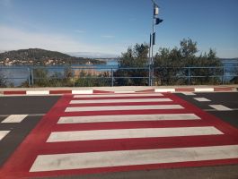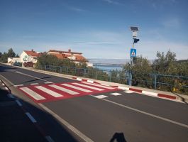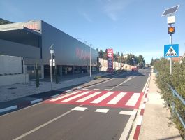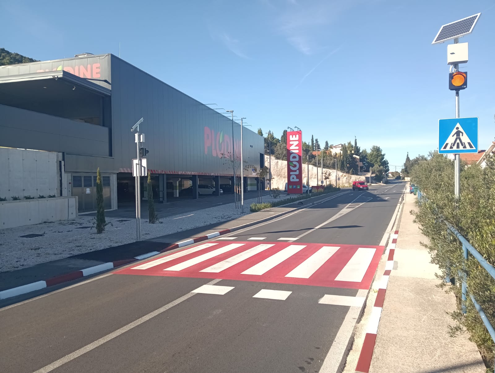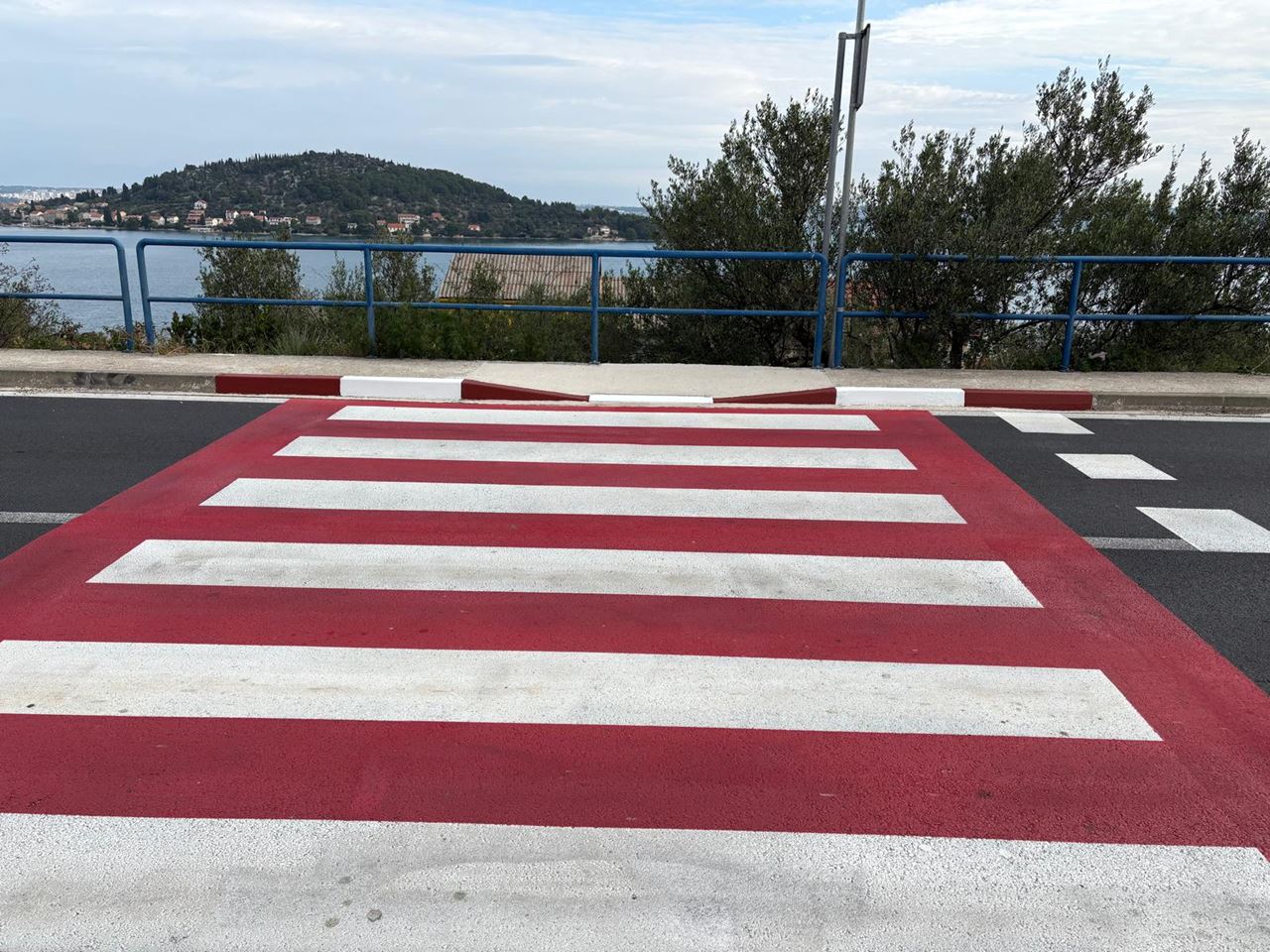 1. Označavanje pješačke površine ispod pješačkog prijelaza crvenom bojom; 2. Postavljenje solarnog led treptača na prometni znak C02; 3. Izvedba zvučnih traka upozorenja debljine 20 mm na prilazu pješačkom prijelazu.