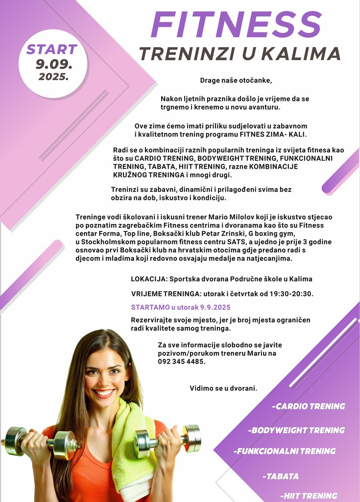 Drage naše otočanke, nakon ljetnih praznika došlo je vrijeme da se trgnemo i krenemo u novu avanturu, stoji na objavljenom pozivu. Ove zime ćemo imati priliku sudjelovati u zabavnom i kvalitetnom trening programu FITNESS ZIMA - KALI.