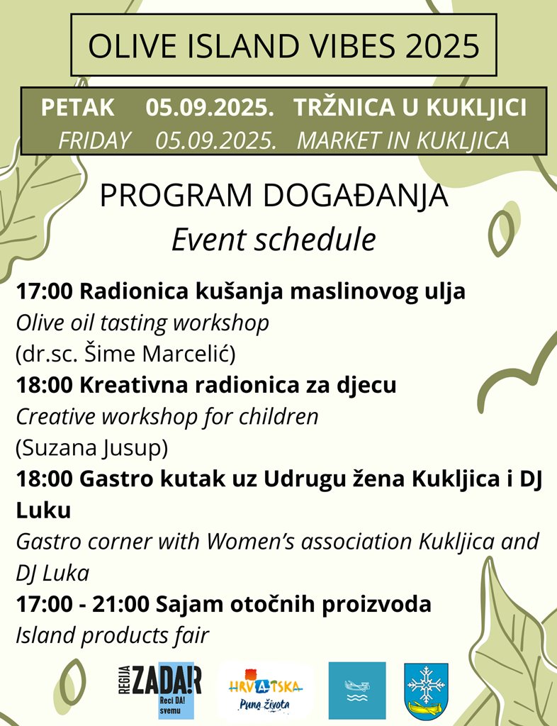 NAJAVA - U petak, 5. rujna 2025. godine, na tržnici u Kukljici održat će se manifestacija Olive Island Vibes 2025, koja donosi bogat program posvećen maslinama, otočnim proizvodima i gastronomiji, kreativnosti i druženju.